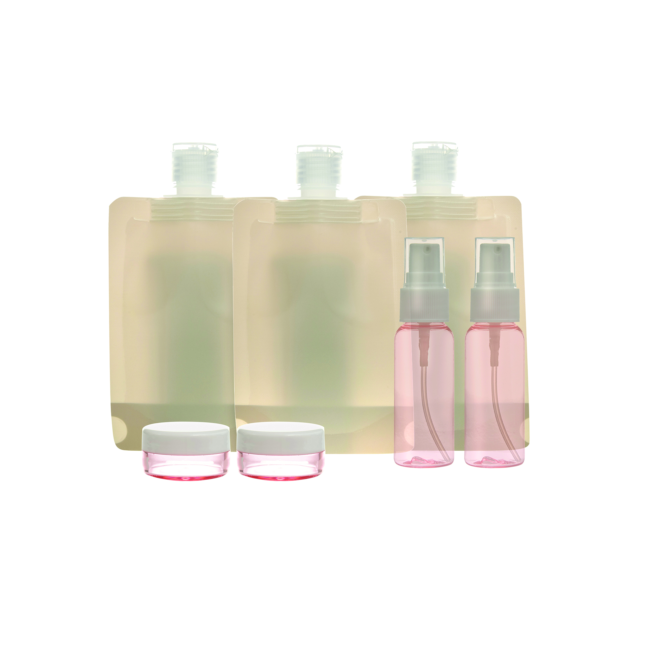 Glær snyrtitaska með tómum ílátum. Travel set.
